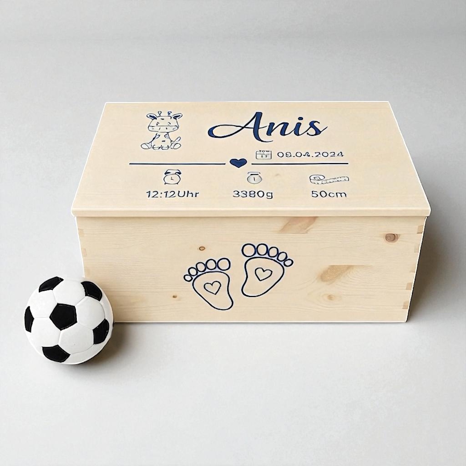 Eine wunderschöne Holzbox, personalisiert mit Namen, Geburtsdatum, Uhrzeit, Größe und Gewicht – der perfekte Platz für die ersten Schätze deines Babys.