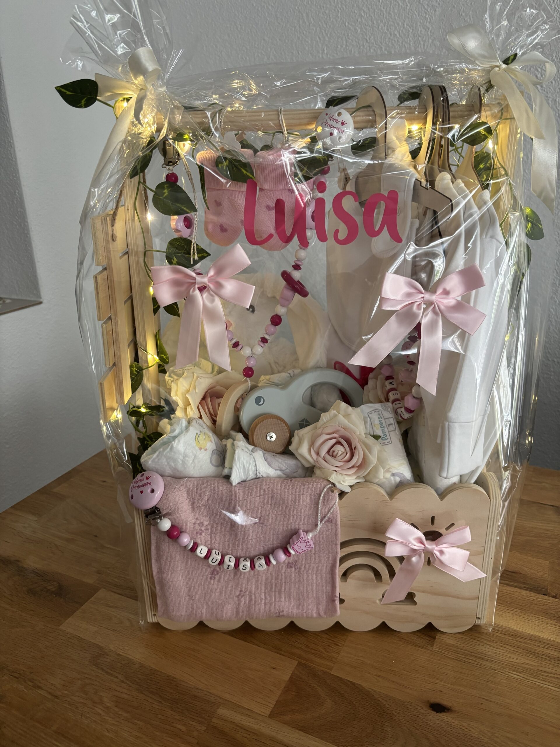 Willkommen kleines Wunder. Dieses personalisiert gestaltete Geschenkset für die kleine Luisa enthält liebevoll ausgewählte Stücke wie Babysöckchen, weiche Kleidung, Schnullerketten und Accessoires. Jedes Teil ist personalisiert und macht das Set zu einem einzigartigen Geschenk zur Geburt oder Taufe.