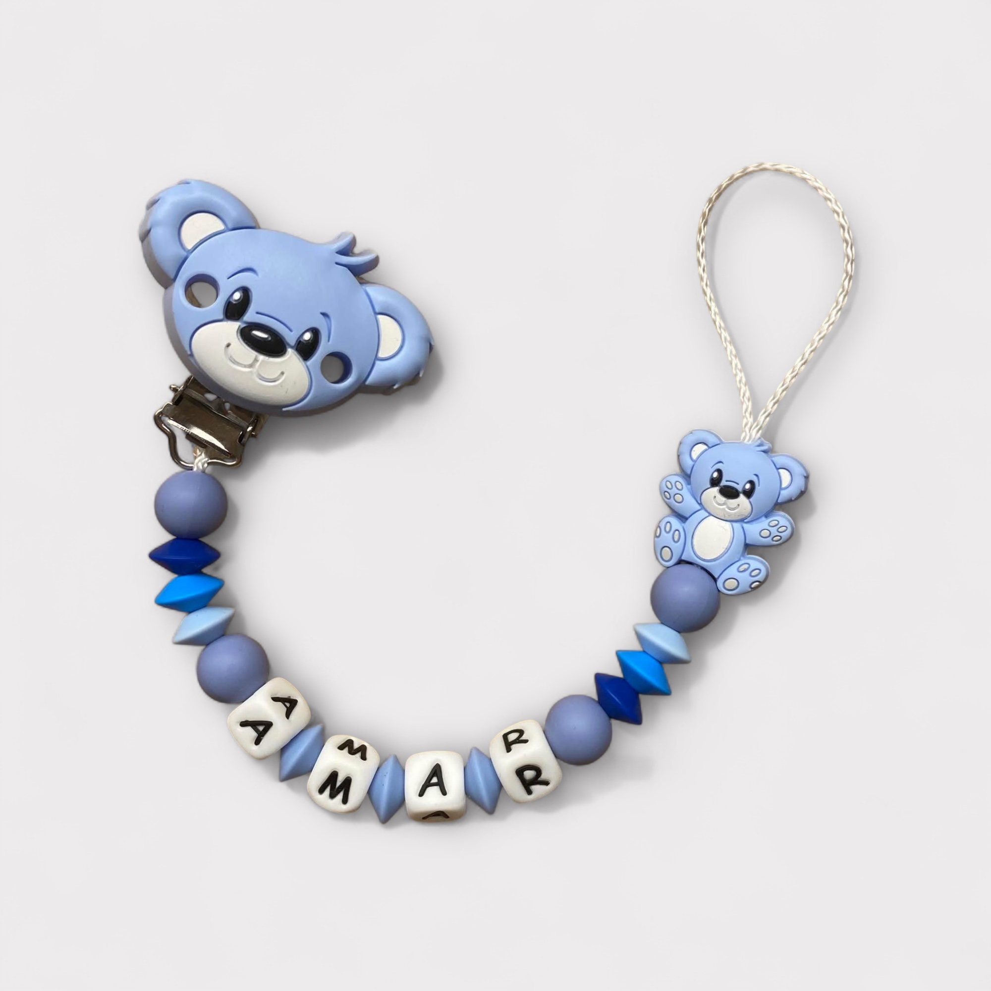 Diese liebevoll gestaltete Schnullerkette ist nicht nur praktisch, sondern auch ein niedliches Accessoire für Ihr Baby. Mit dem Namen Ihres Kindes – wie im Beispiel „Amar“ – wird jede Kette zu einem ganz besonderen Unikat.