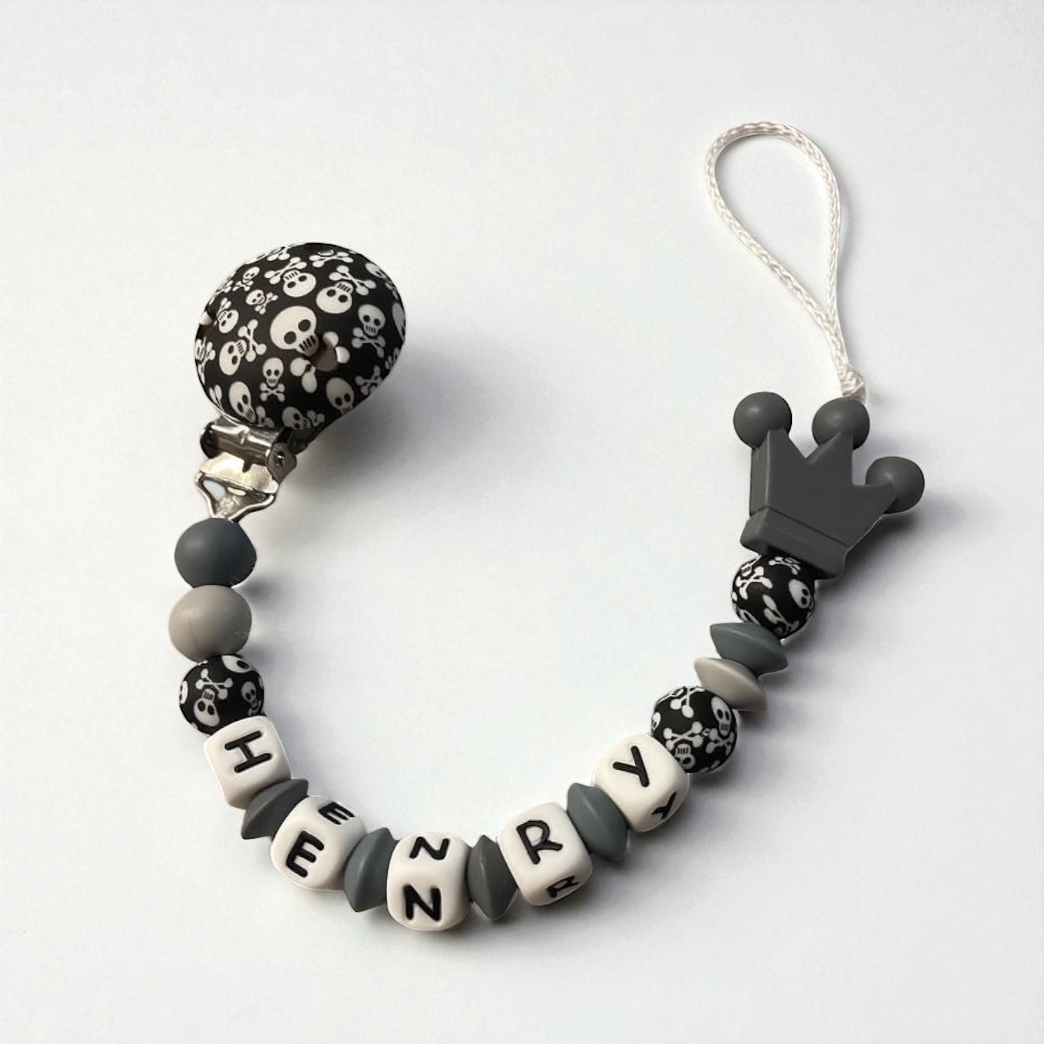Die Kombination aus Schwarz, Grau und Weiß mit Totenkopf-Motiven und einem süßen Kronen-Element macht diese Nuggikette zu einem echten Hingucker.