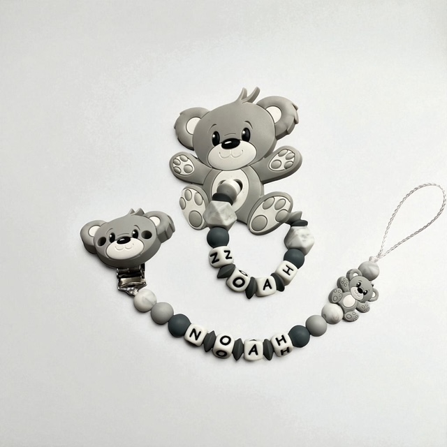 Dieses liebevoll gestaltete Babyset besteht aus einer Nuggikette und einem passenden Beißring im niedlichen Bärchen-Design. Mit dem individuellen Namen – wie im Beispiel „Noah“ – wird es zu einem einzigartigen Unikat.
