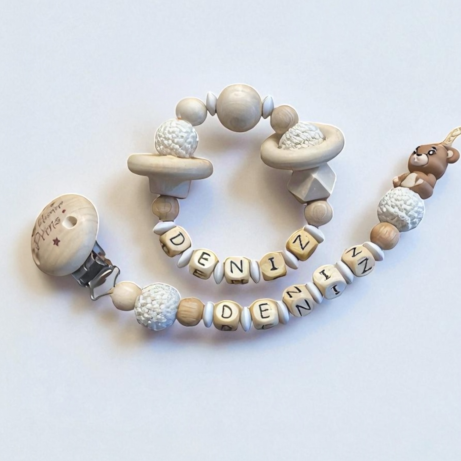 Dieses liebevolle Babyset besteht aus einer Nuggikette und einem passenden Greifling. In sanften Natur- und Weißtönen gestaltet, wirkt es edel und zeitlos. Mit dem Namen des Kindes – wie im Beispiel „Deniz“ – wird es zu einem ganz besonderen Unikat.