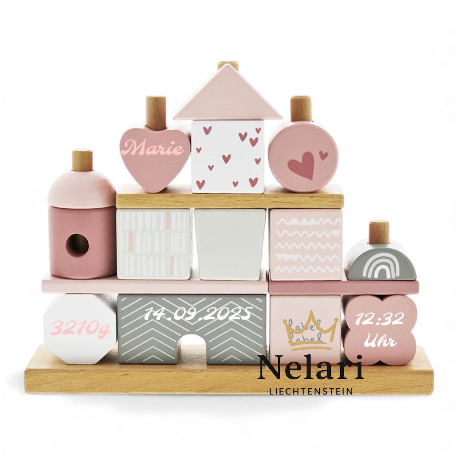 Die einzelnen Bausteine sind in harmonischen Farben gestaltet und können mit den wichtigsten Geburtsdaten personalisiert werden: Name, Datum, Gewicht und Uhrzeit.