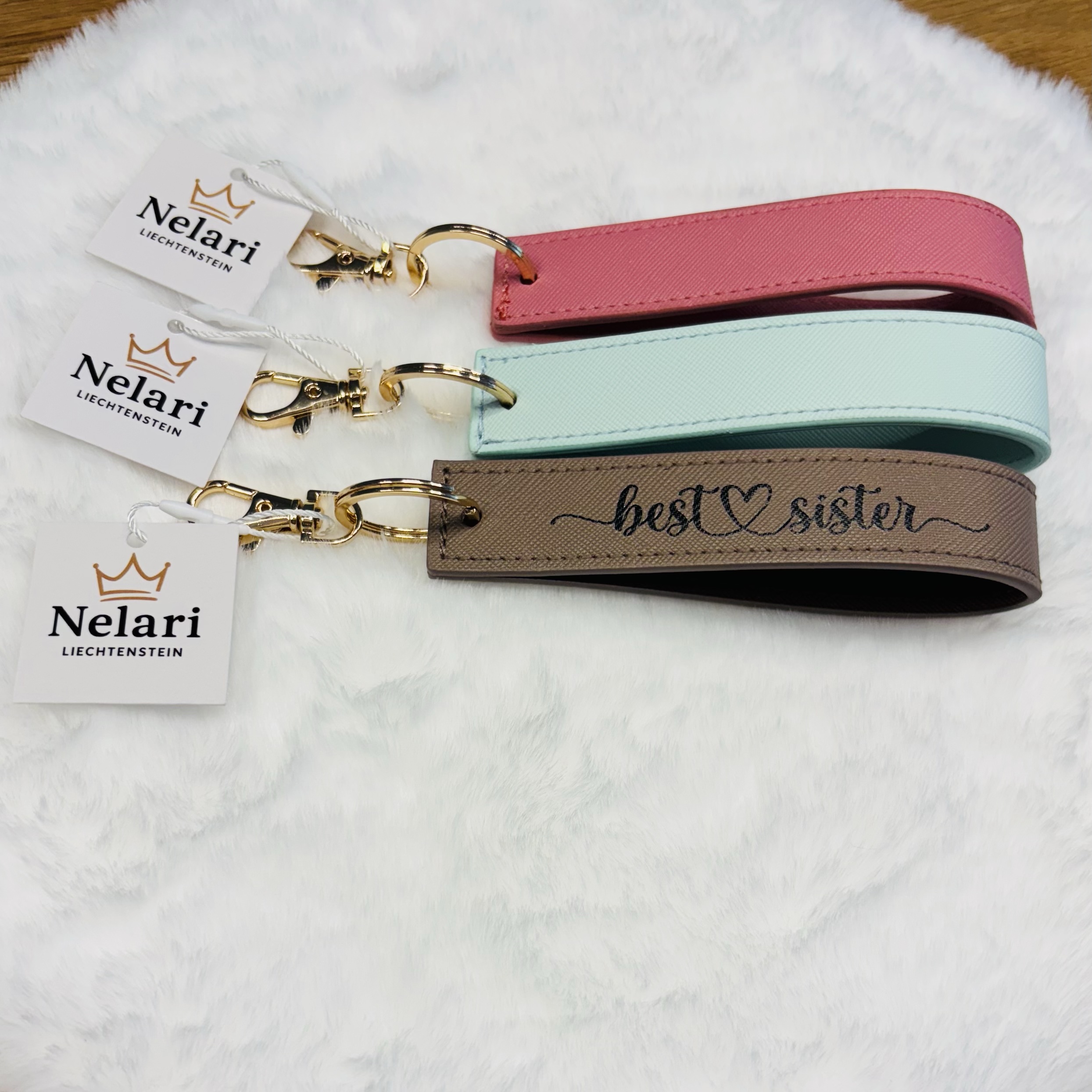 Hochwertiger Schlüsselanhänger aus feinem Kunstleder – beidseitig individuell mit Namen personalisierbar.