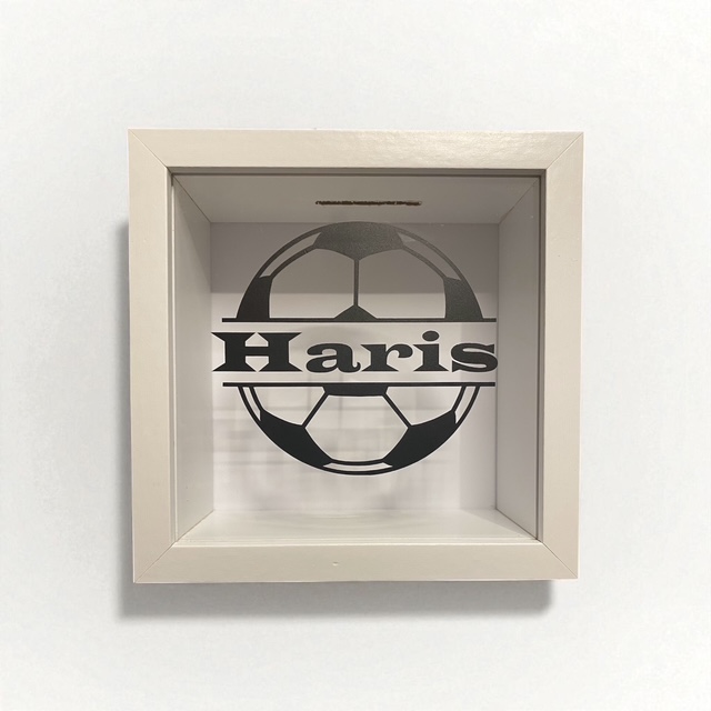Diese personalisierte Spardose im Bilderrahmen-Stil wird mit deinem Wunschnamen vorne und einem Lieblingsmotiv im Hintergrund gestaltet. Ob Fußball, Herz oder Krone – so wird die Spardose zum echten Unikat und einem besonderen Highlight.